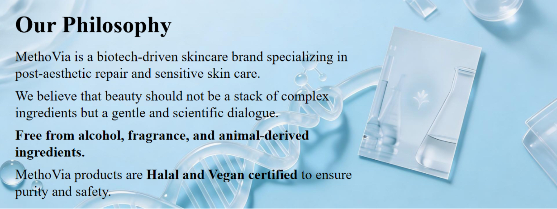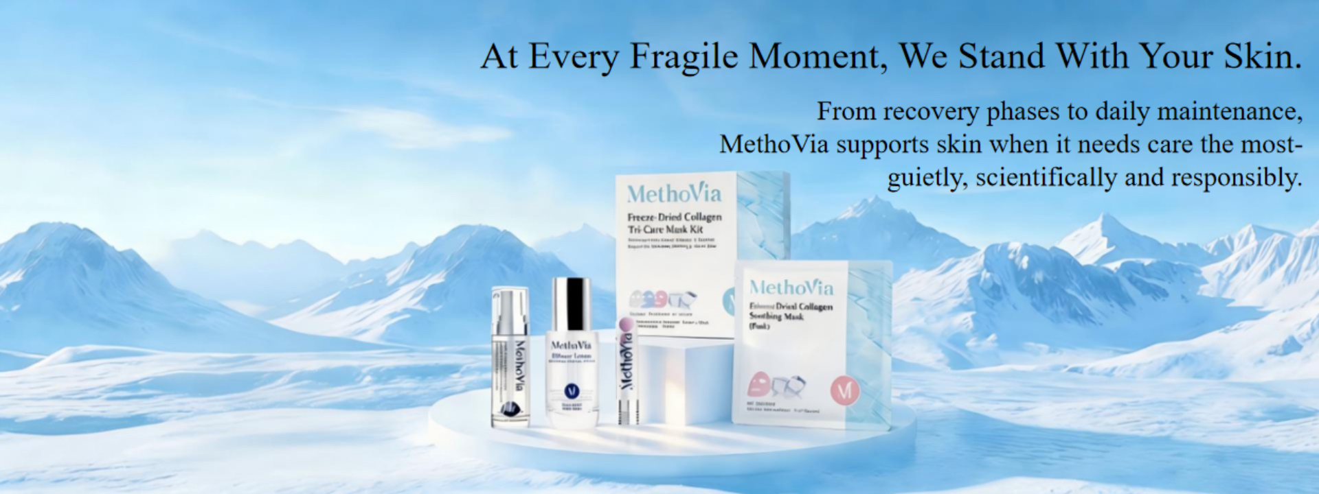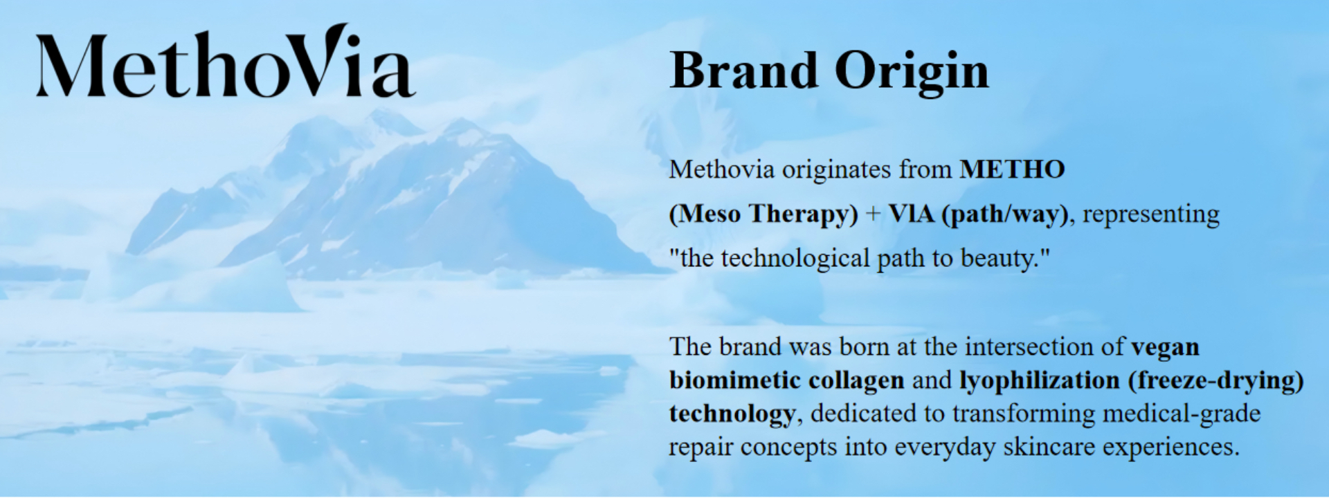 Methovia originates from METHO (Meso Therapy) + VlA (path/way), representing “the technological path to beauty.” The brand was born at the intersection of vegan biomimetic collagen and lyophilization (freeze-drying) technology, dedicated to transforming medical-grade repair concepts into everyday skincare experiences.