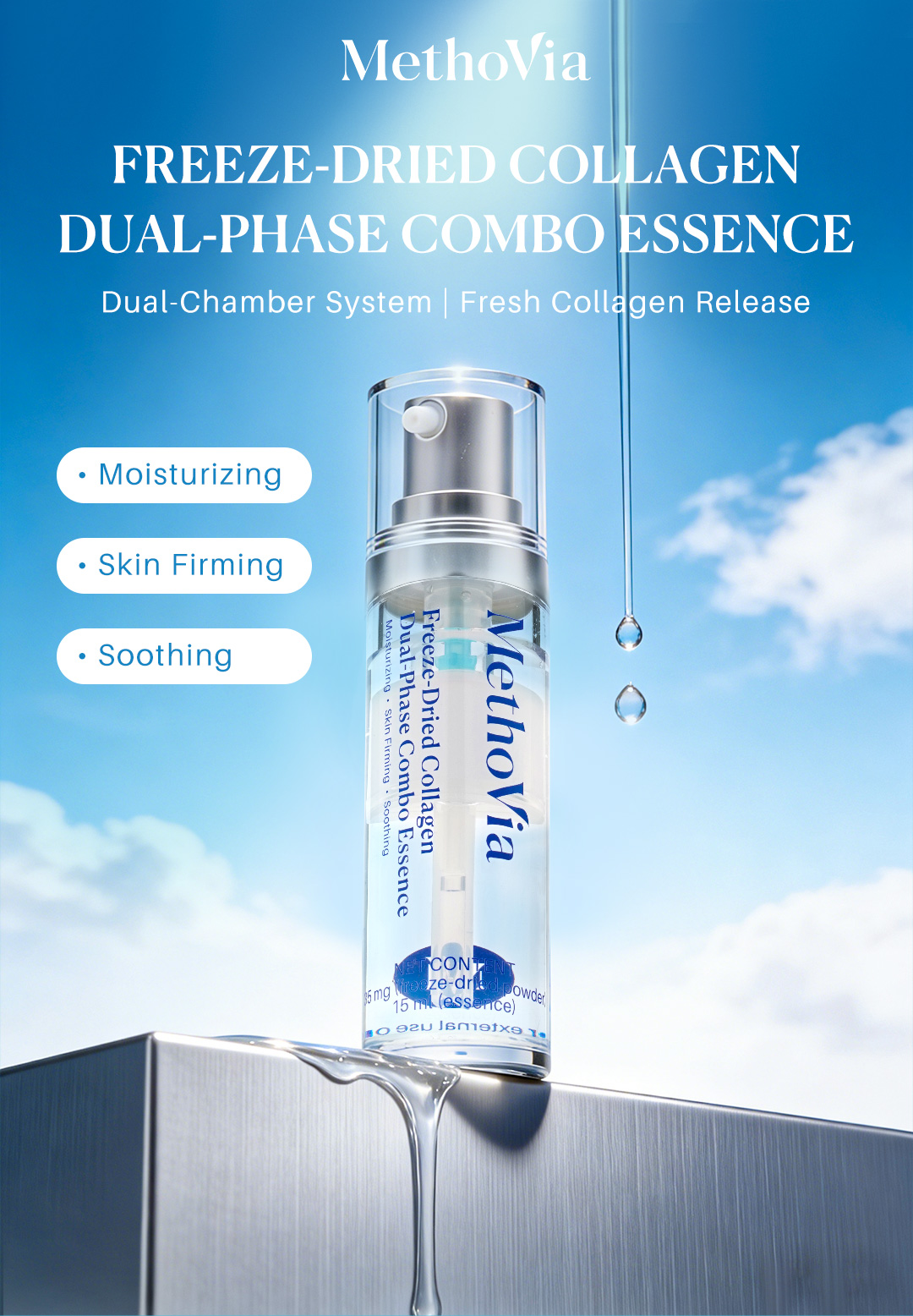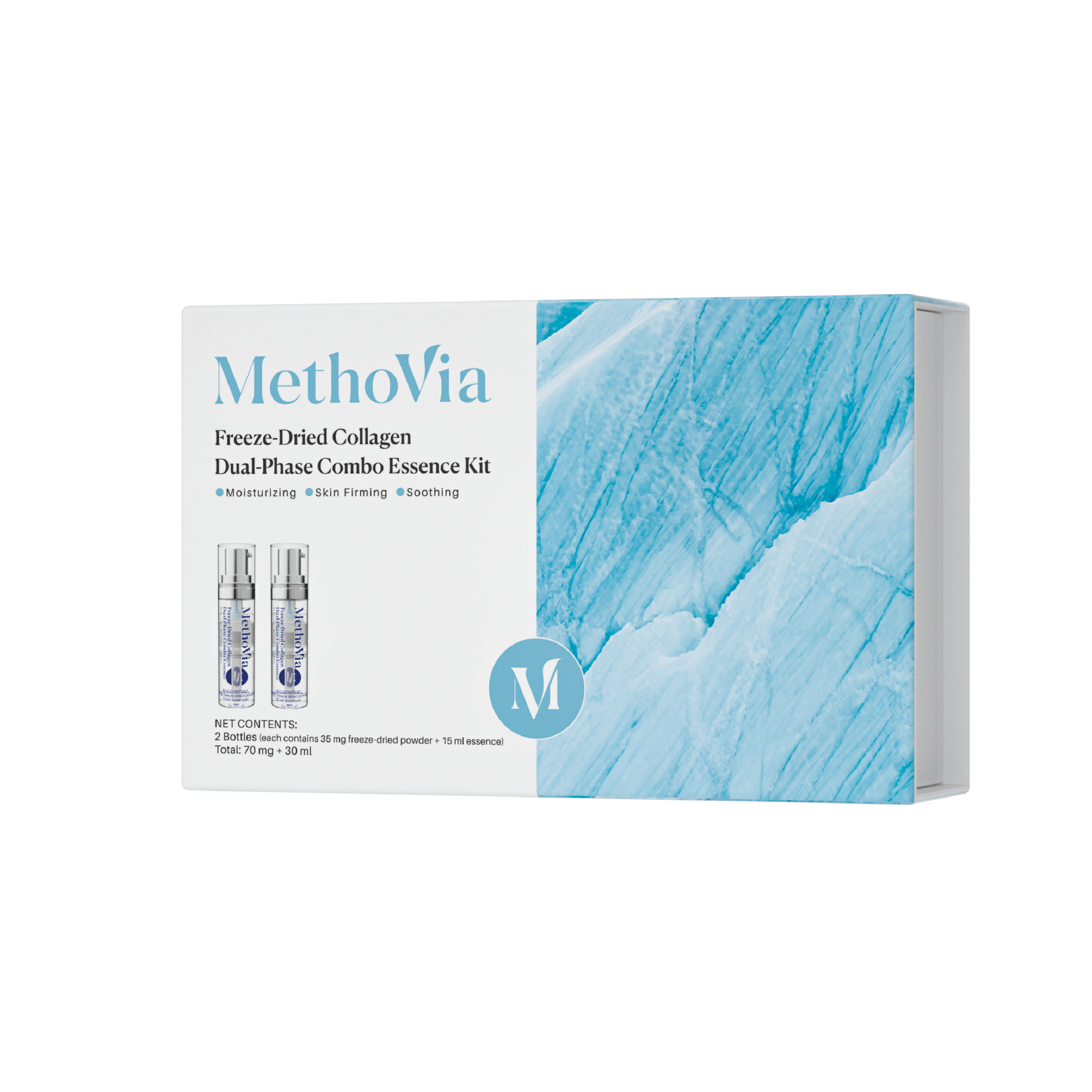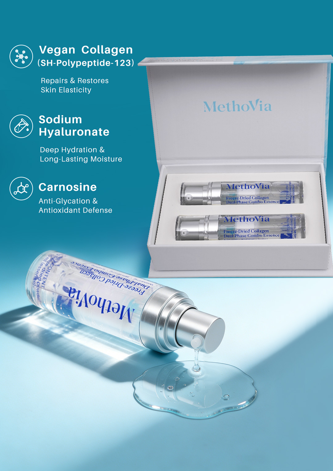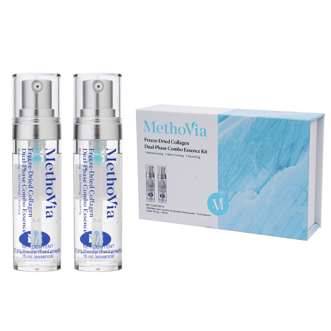 MethoVia™ Freeze-Dried Collagen Dual-Phase Combo Essence Kit includes 2 bottles, each pairing freeze-dried powder with a hydrating essence.