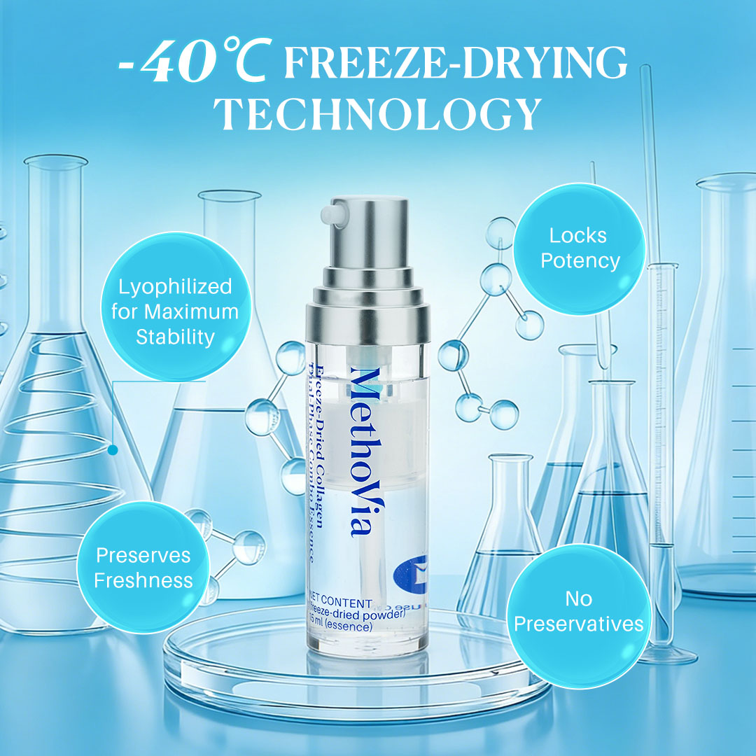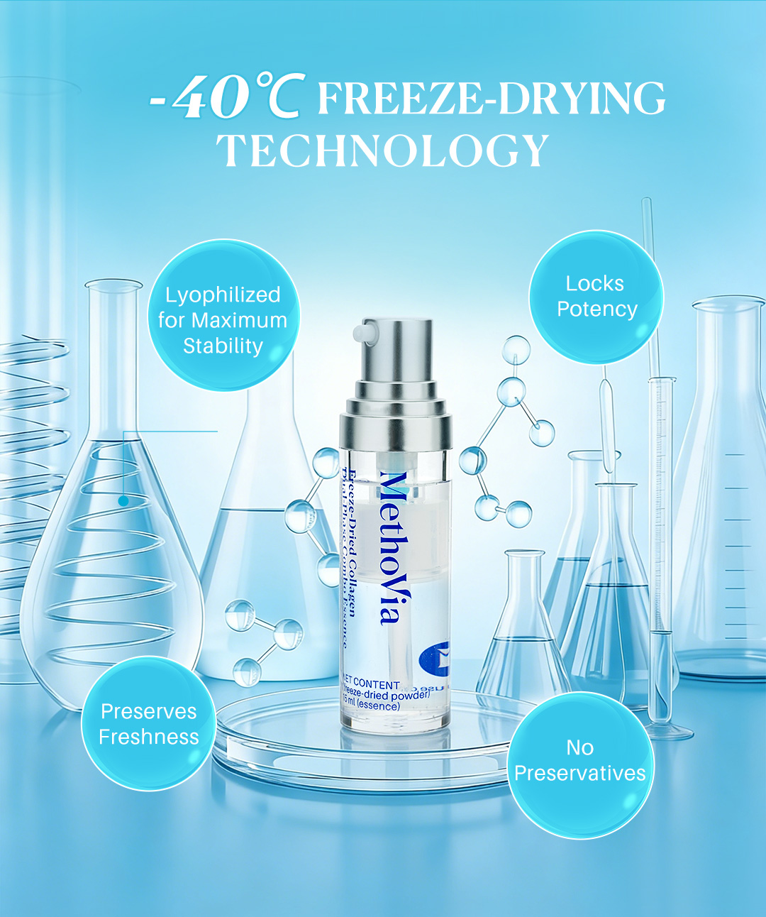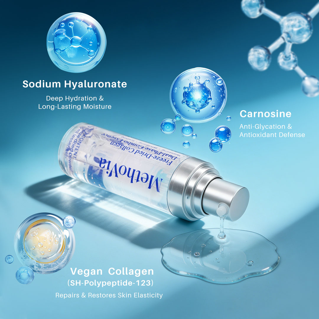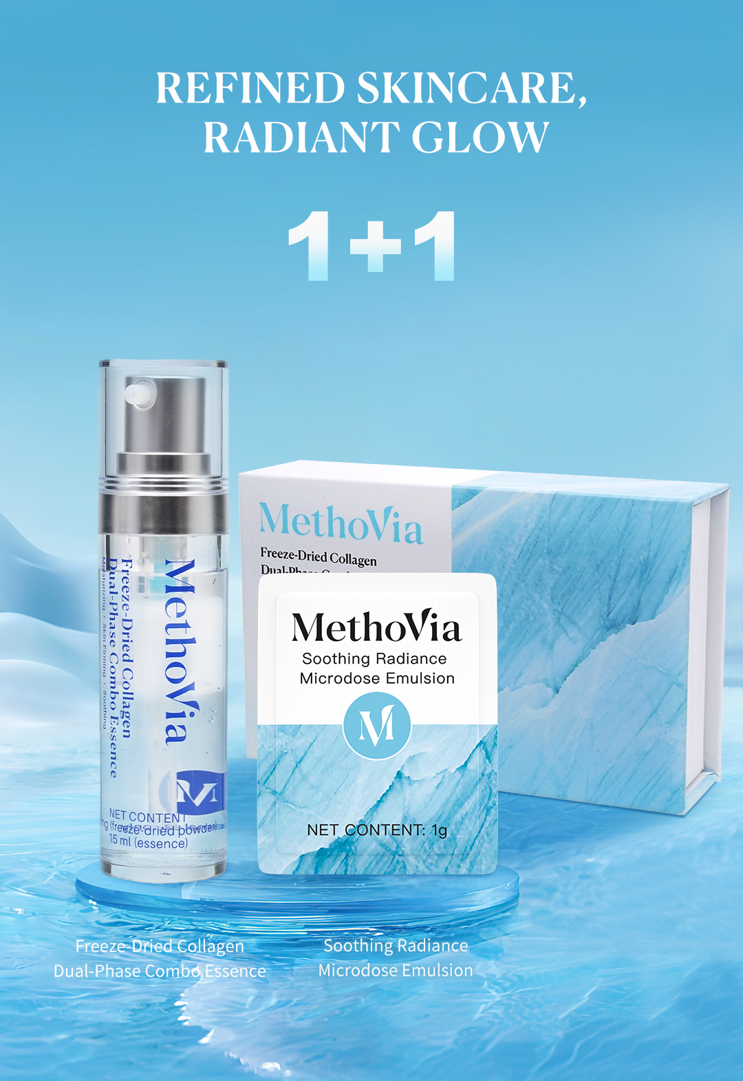 MethoVia™ Freeze-Dried Collagen Dual-Phase Combo Essence Kit includes 2 bottles, each pairing freeze-dried powder with a hydrating essence.