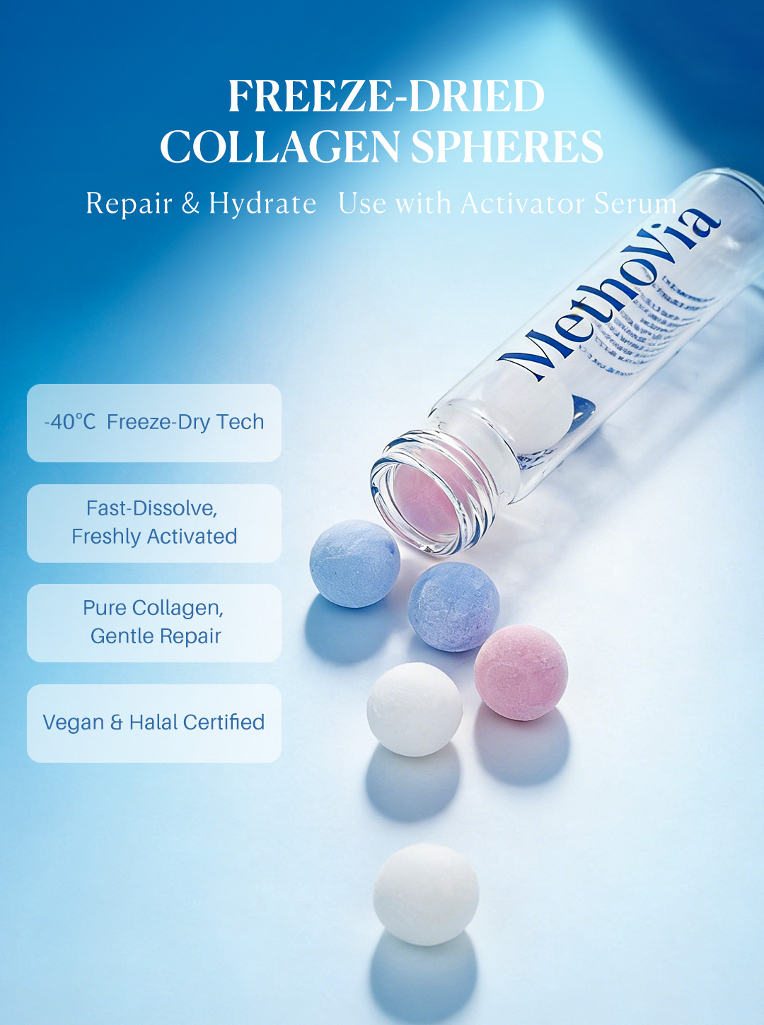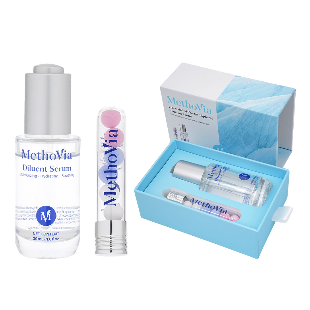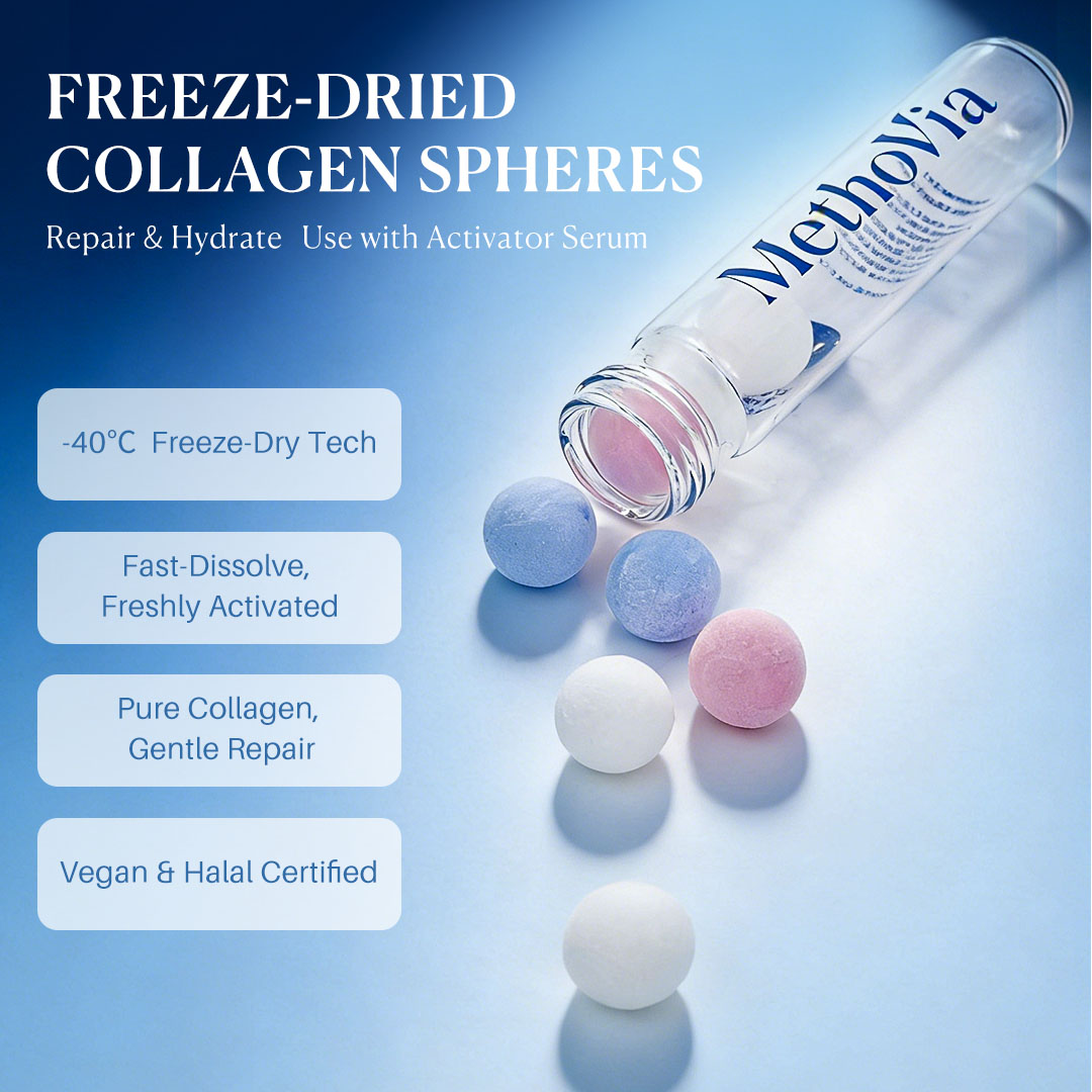 MethoVia Freeze-dried Collagen Spheres + Diluent Serum combines dual-phase activation technology in a two-part system: