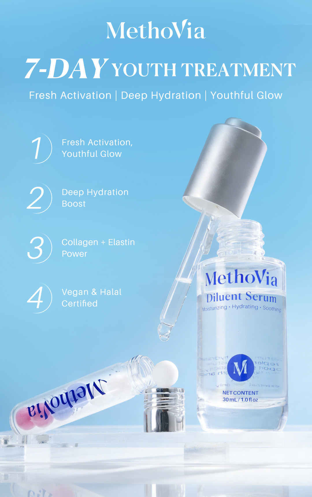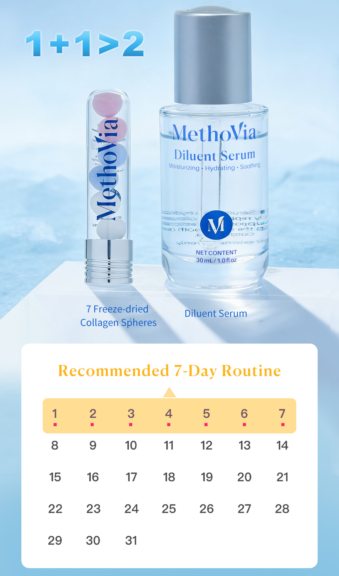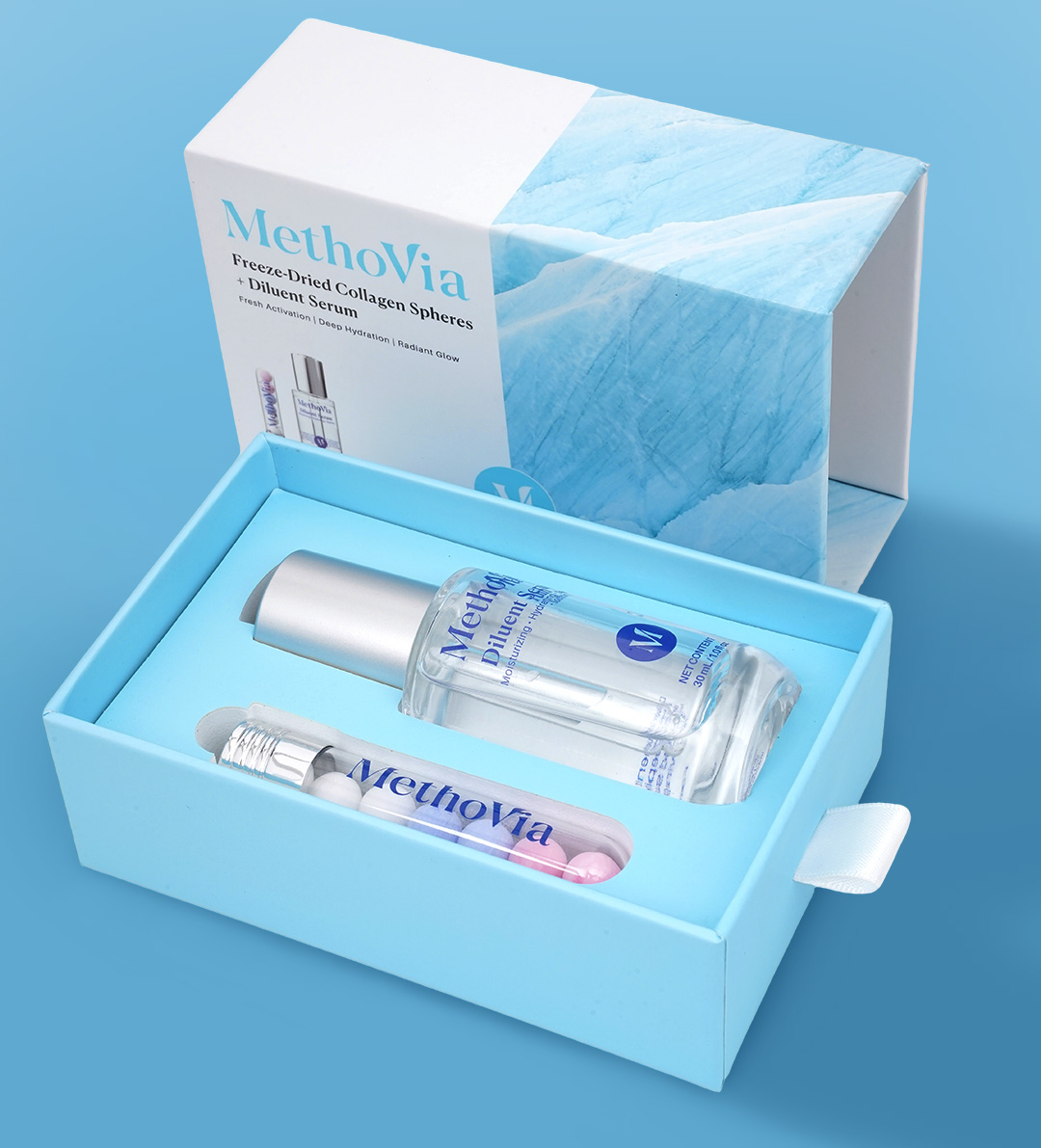 MethoVia Freeze-dried Collagen Spheres + Diluent Serum combines dual-phase activation technology in a two-part system: